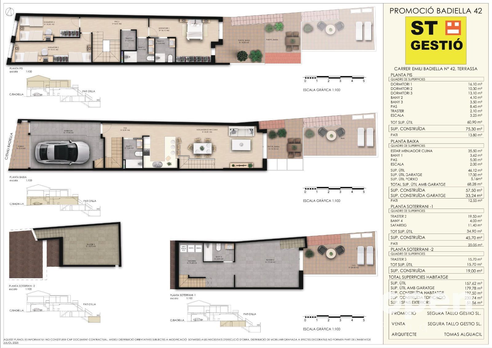 Planta Primera: Disposa de 3 hab. Dobles (1 en suite amb bany), un segon bany complet, Terrassa de 14m2 amb sortida des de la Suite i escala accés pati inferior.