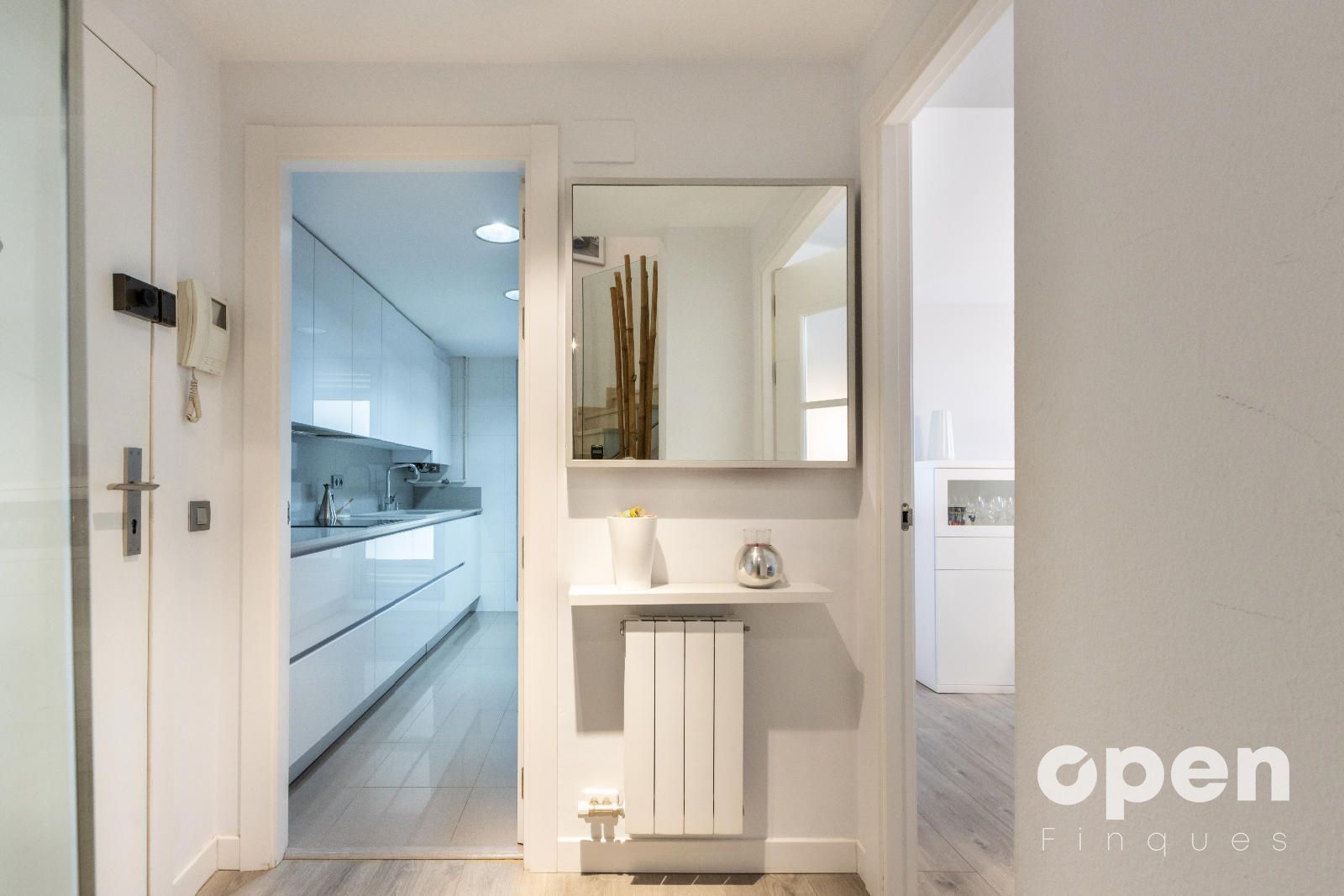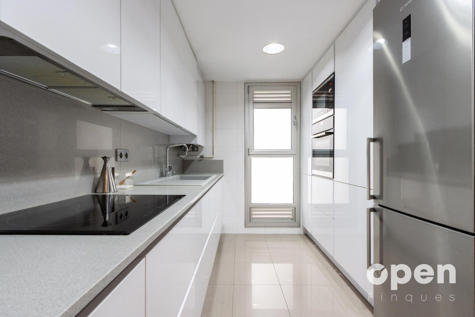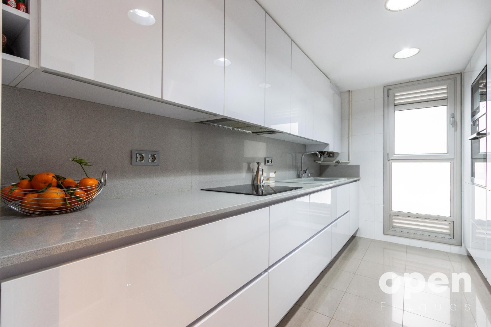 • Cocina exterior de 9 m², totalmente reformada, con muebles lacados en blanco.